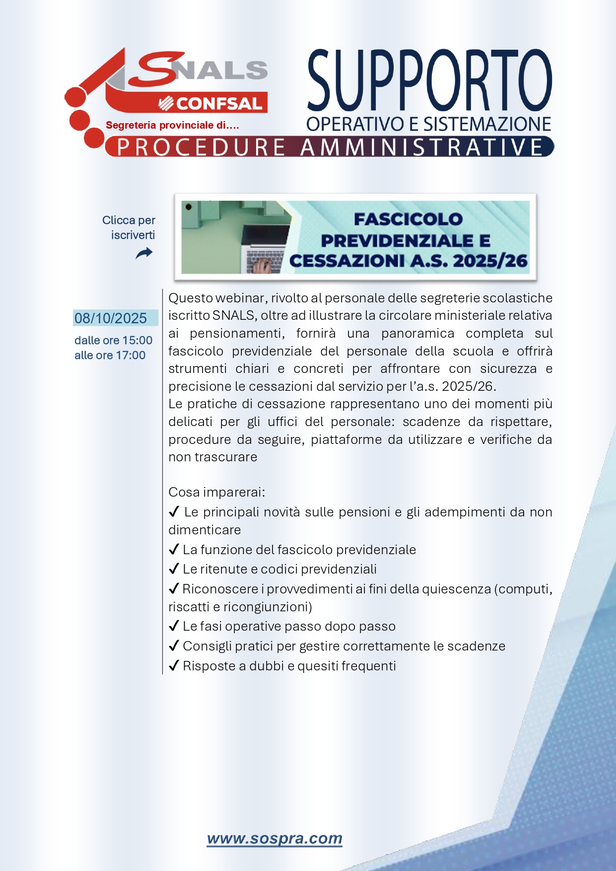 Lo SNALS CONFSAL organizza, ai sensi della normativa vigente, un incontro di Formazione in presenza,