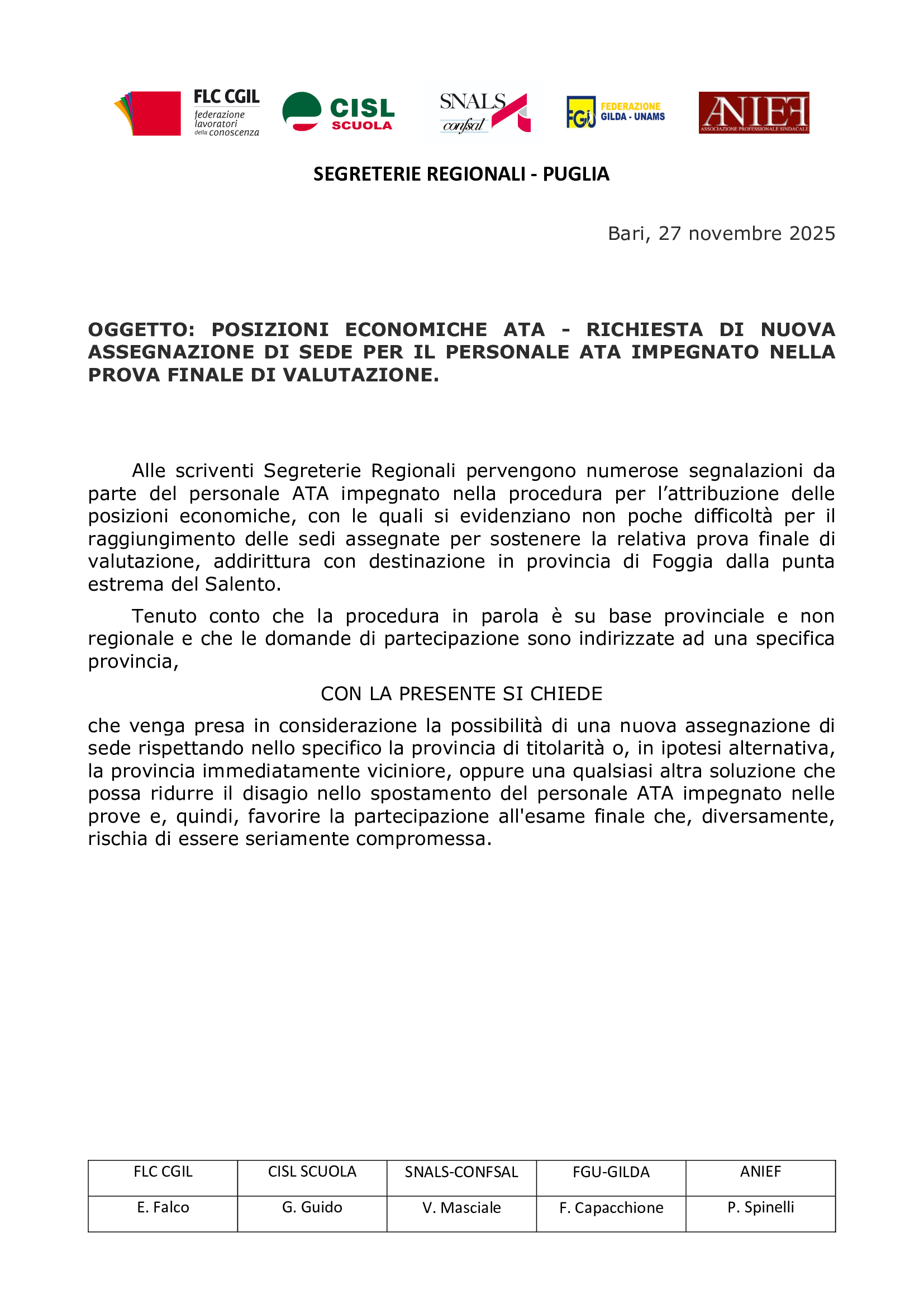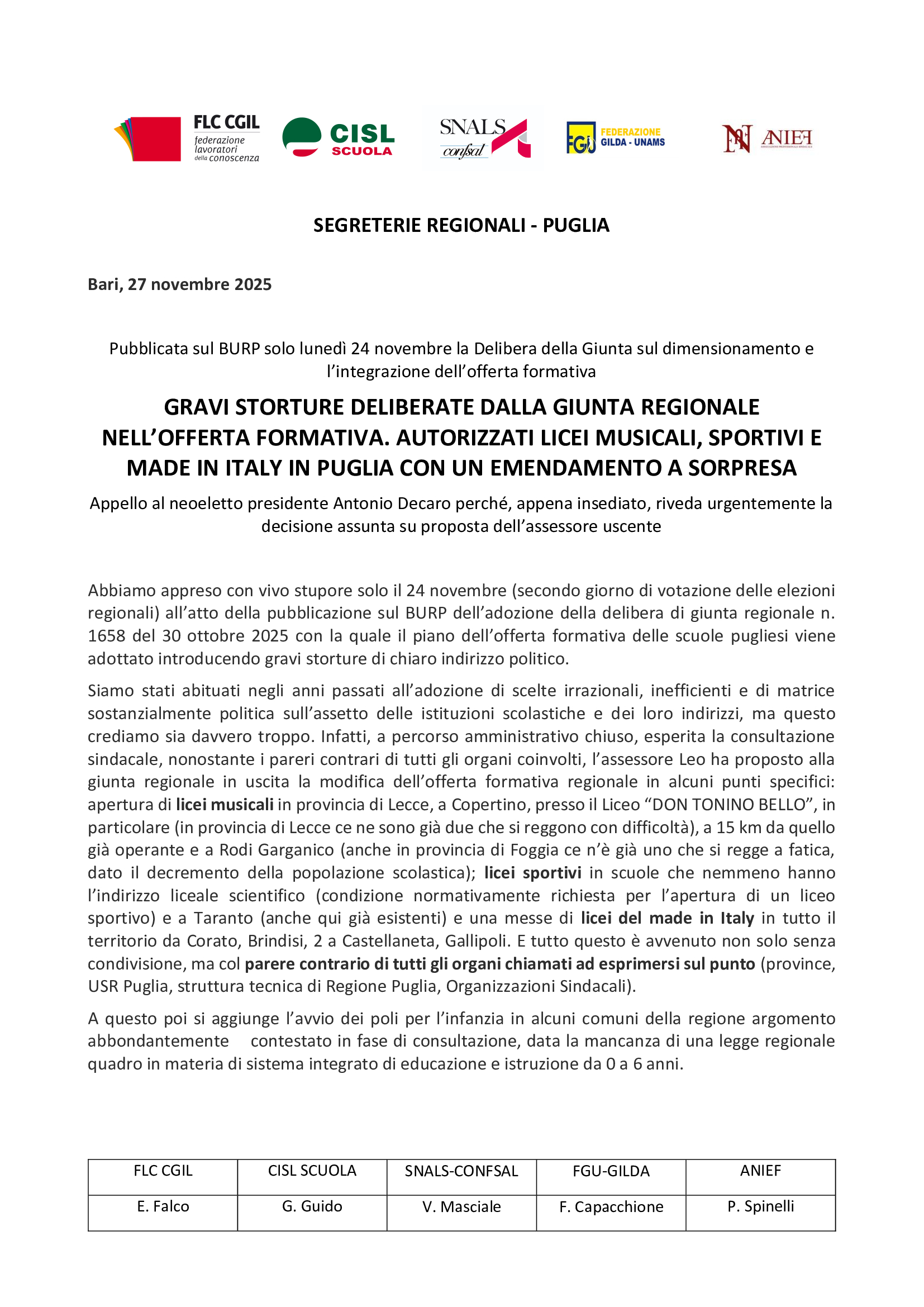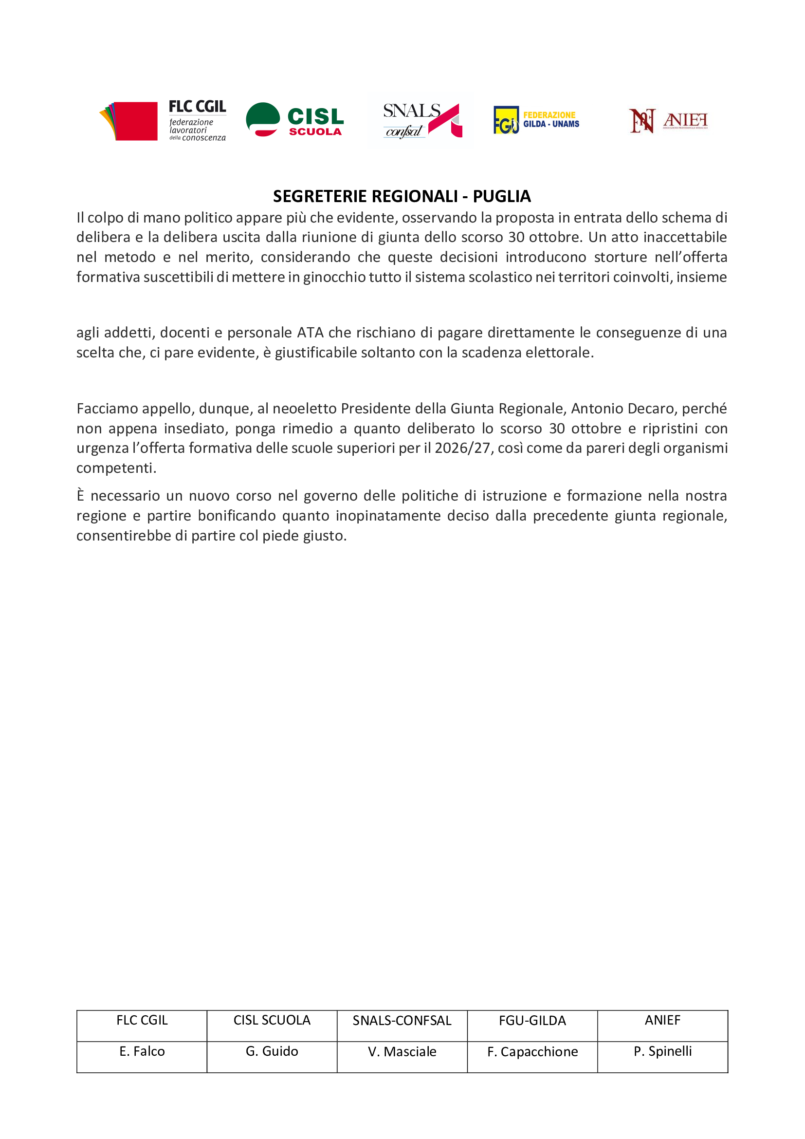 FSUR CISL, UIL SCUOLA RUA, SNALS CONFSAL, GILDA UNAMS, ANIEF